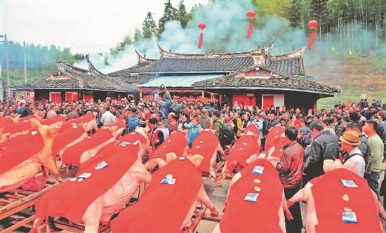 安置在最后層空闊院子里的,是幾十口褪了毛白花花的大肥豬。這些豬都頭朝著里屋,背上貼了紅紙,嘴里插著燃香,破開的肚皮下墊起了個兩尺高的斜架,內臟和下水盛放在架子下邊的簸箕里。大的豬一口有五百多斤,一般的都不下三百。一行行、一列列,如同受閱的方陣,在安靜地等候著祖爺的光顧。