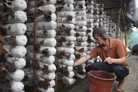 四年前,在廈門打工的陳丁朝發(fā)現(xiàn)市場上黑木耳的銷售行情不錯下定決心回鄉(xiāng)自主創(chuàng)業(yè)——栽培黑木耳。經(jīng)過幾年的辛勤創(chuàng)業(yè),陳丁朝現(xiàn)在共栽培黑木耳4 萬袋,平均一天能有2000 斤的產(chǎn)量,產(chǎn)品銷往福州、泉州、廈門、江西、廣東等地,年收入可達10 萬余元。他還成為武陵鄉(xiāng)茶山村黑木耳培殖的帶頭人,帶動了周邊20 多戶農(nóng)民一同栽培黑木耳。目前,茶山村共栽培100 多萬袋的黑木耳,年產(chǎn)值超過500 萬元,成為大田有名的黑木耳專業(yè)村。