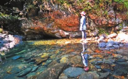 陽光越過頭頂時,峽谷里逐漸亮堂了起來,有些樹葉開始閃爍金光,河面上籠罩著斑駁的油彩。潭里的影子忽明忽滅,蟲子在水上滑行,游魚在石隙間嬉戲,五彩石眨著眼皮笑看人世匆匆。有青苔附在崖壁上靠自身的腐爛生長,它們懸空吊著水珠,不像魚兒可以攝取掉入潭中的野果和樹葉充饑。同行者被這一幕感動了,大家走走停停,不忘掏出手機給自己和苔蘚來張特寫,激情溶山水,心靈愈超脫。