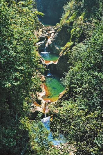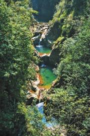 十八潭被游客稱作“南方九寨溝”,全長約4.6公里的河道上布滿了瑤池、明鏡、翡翠、五彩、知音、忘憂、聚寶、望月等潭,著名的瀑布含水簾、瀉玉、龍門、雙飛、三疊、丫字等處,水光山色渾然一體。泉、瀑、潭、池相映成趣,老樹與奇石交媾,碧水和蜂蝶齊舞,蜘蛛吊在草莖上隨風搖曳,野果芬芳里彌漫出花香的氣息。