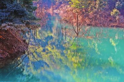 如今的十八潭風景如畫,這里靜若處子,恍如隔世,沒有人為的喧囂,沒有煽情做作的表演。天藍水也藍,原始自然的溪潭,盡善盡美,流淌著樸素之光!