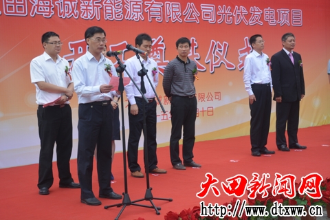 副縣長涂劍峰在致辭中說,近年來,大田縣大力實施“轉型驅動、綠色發展”戰略,積極布局一批新型工業、高新技術和節能環保產業,逐漸走出了一條“產城融合、城鄉統籌”的發展道路。農業光伏發電項目把光伏發電和現代農業建設結合起來,是國家產業鼓勵扶持項目,具有科技含量高、市場前景廣、綜合效益好等優勢,是一項前景廣闊的朝陽產業。海誠新能源光伏發電項目的開工建設,既是全縣招商引資和重大項目建設的一個新亮點,也是美麗鄉村和生態文明建設的新成果,更是三次產業融合發展的新樣板,對于推動該縣產業轉型升級具有十分重要的意義。