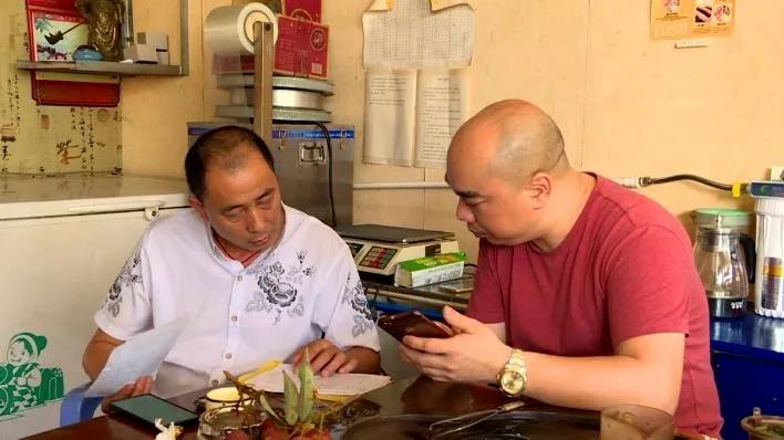 張旺文與合作伙伴正在核對賬目(右為張旺問)。江月蘭 攝