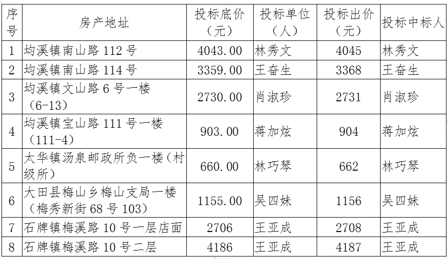 中國郵政集團有限公司三明市分公司對福建省大田縣分公司8處店面房屋對外出租公開招租于1月4日開標評審,根據評審結果,中標候選人公告如下: 公示期:2022年1月20日-1月22日,共3天。