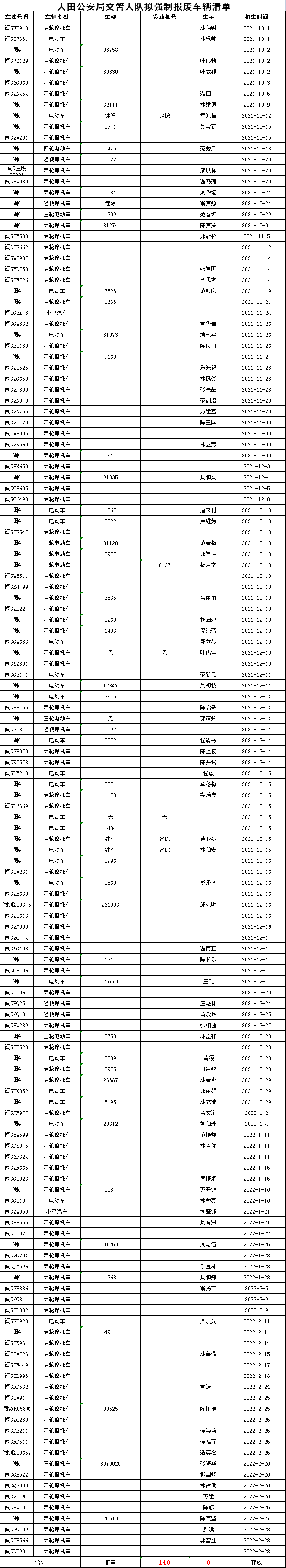 大田縣公安局交通警察大隊 關(guān)于擬對140輛機(jī)動車強(qiáng)制報廢的公告 根據(jù)《道路交通安全法實施條例》第一百零七條、《中華人民共和國道路交通安全法》第一百一十二條之規(guī)定,被扣留的機(jī)動車,駕駛?cè)嘶蛘咚腥恕⒐芾砣?0日內(nèi)沒有提供被扣留機(jī)動車的合法證明,沒有補(bǔ)辦相應(yīng)手續(xù),或者不前來接受處理的,經(jīng)公安交警部門通知并且經(jīng)公告3個月內(nèi)仍不前來接受處理的,由公安機(jī)關(guān)交警部門對該機(jī)動車依法進(jìn)行處理。現(xiàn)我隊依法對以下140輛機(jī)動車進(jìn)行公告(車輛詳情見附件),請機(jī)動車駕駛?cè)嘶蛘咚腥恕⒐芾砣俗怨嫫?個月內(nèi)提供被扣留機(jī)動車的合法證明到大田縣公安局交通警察大隊接受處理,逾期未處理的機(jī)動車將按規(guī)定進(jìn)行強(qiáng)制報廢。 特此公告 大田縣公安局交通警察大隊 2022年04月08日