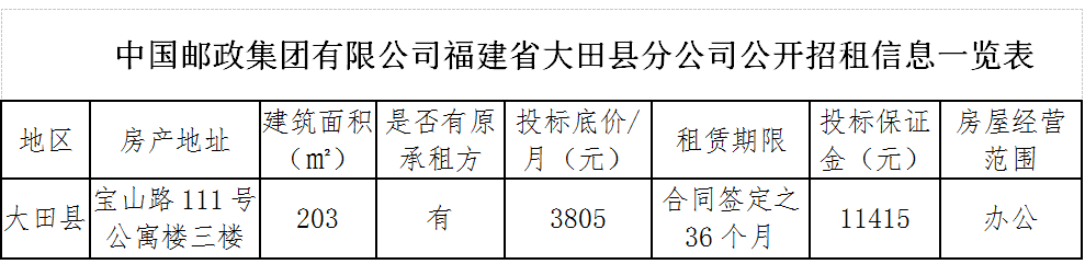 中國郵政集團有限公司福建省大田縣分公司房屋出租公開招租公告中國郵政集團有限公司福建省大田縣分公司(招租人)就大田縣寶山路111號公寓樓3樓房產對外出租公開招租,歡迎有意向的承租人前來響應報價。 一、招租內容