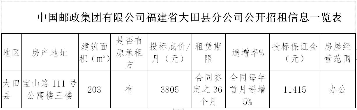 中國(guó)郵政集團(tuán)有限公司福建省大田縣分公司房屋出租公開(kāi)招租公告(第二輪)中國(guó)郵政集團(tuán)有限公司福建省大田縣分公司(招租人)就大田縣寶山路111號(hào)公寓樓3樓房產(chǎn)對(duì)外出租公開(kāi)招租,歡迎有意向的承租人前來(lái)響應(yīng)報(bào)價(jià)。 一、招租內(nèi)容