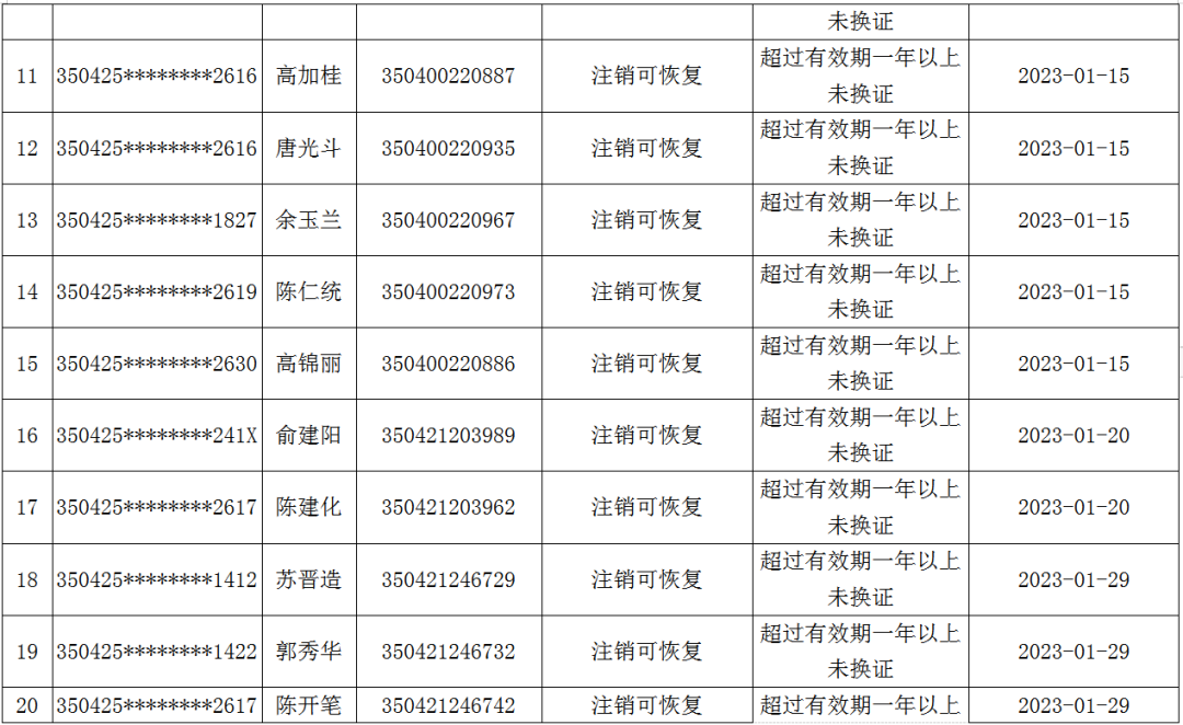 大田縣公安局交通警察大隊(duì)關(guān)于依法對(duì) 24名機(jī)動(dòng)車(chē)駕駛?cè)笋{駛證作廢的公告 各機(jī)動(dòng)駕駛?cè)耍?/span> 根據(jù)《機(jī)動(dòng)車(chē)駕駛證申領(lǐng)和使用規(guī)定》(公安部第162號(hào)令)第七十九條第八款之規(guī)定:“超過(guò)機(jī)動(dòng)車(chē)駕駛證有效期一年以上未換證的。車(chē)輛管理所應(yīng)當(dāng)注銷(xiāo)其機(jī)動(dòng)車(chē)駕駛證”。截止2023年01月31日,下列24名機(jī)動(dòng)車(chē)駕駛?cè)耍ㄇ鍐卧斠?jiàn)附件)的駕駛證因上述原因已被注銷(xiāo),由于其機(jī)動(dòng)車(chē)駕駛證未回收,現(xiàn)依法予以公告作廢。 大田縣公安局交通警察大隊(duì) 2023年2月14日 附件:作廢名單
