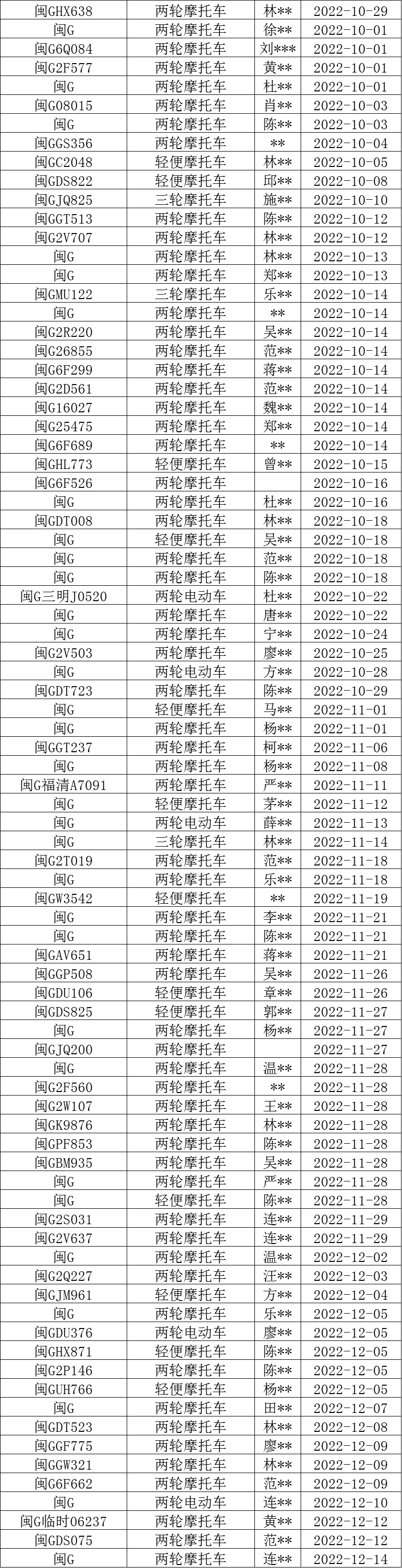大田縣公安局交通警察大隊 關于擬對83輛機動車強制報廢的公告 根據《道路交通安全法實施條例》第一百零七條、《中華人民共和國道路交通安全法》第一百一十二條之規定,被扣留的機動車,駕駛人或者所有人、管理人30日內沒有提供被扣留機動車的合法證明,沒有補辦相應手續,或者不前來接受處理的,經公安交警部門通知并且經公告3個月內仍不前來接受處理的,由公安機關交警部門對該機動車依法進行處理。現我隊依法對以下83輛機動車進行公告(車輛詳情見附件),請機動車駕駛人或者所有人、管理人自公告起3個月內提供被扣留機動車的合法證明到大田縣公安局交通警察大隊接受處理,逾期未處理的機動車將按規定進行強制報廢。 特此公告 大田縣公安局交通警察大隊 2023年03月15日