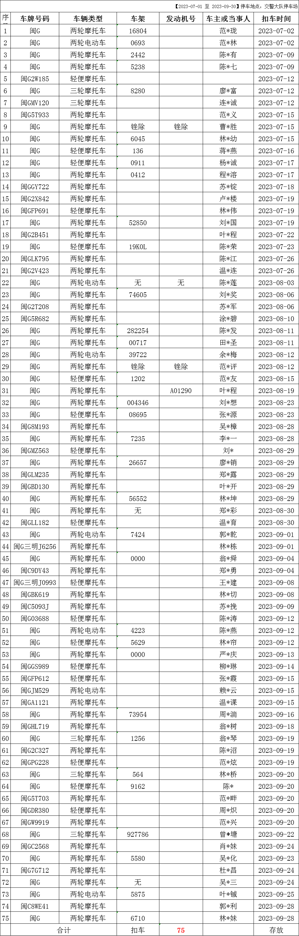 大田縣公安局交通警察大隊 關于擬對75輛機動車強制報廢的公告 根據《道路交通安全法實施條例》第一百零七條、《中華人民共和國道路交通安全法》第一百一十二條之規定,被扣留的機動車,駕駛人或者所有人、管理人30日內沒有提供被扣留機動車的合法證明,沒有補辦相應手續,或者不前來接受處理的,經公安交警部門通知并且經公告3個月內仍不前來接受處理的,由公安機關交警部門對該機動車依法進行處理。 現我隊依法對以下75輛機動車進行公告(車輛詳情見附件),請機動車駕駛人或者所有人、管理人自公告起3個月內提供被扣留機動車的合法證明到大田縣公安局交通警察大隊接受處理,逾期未處理的機動車將按規定進行強制報廢。 特此公告 大田縣公安局交通警察大隊 2023年11月24日