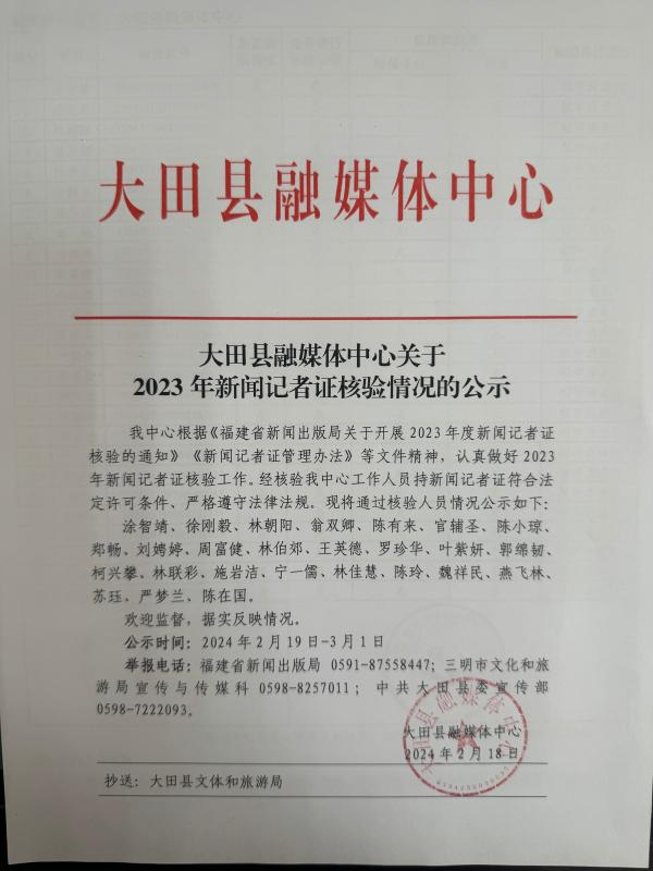 大田縣融媒體中心關于2023年新聞記者證核驗情況的公示