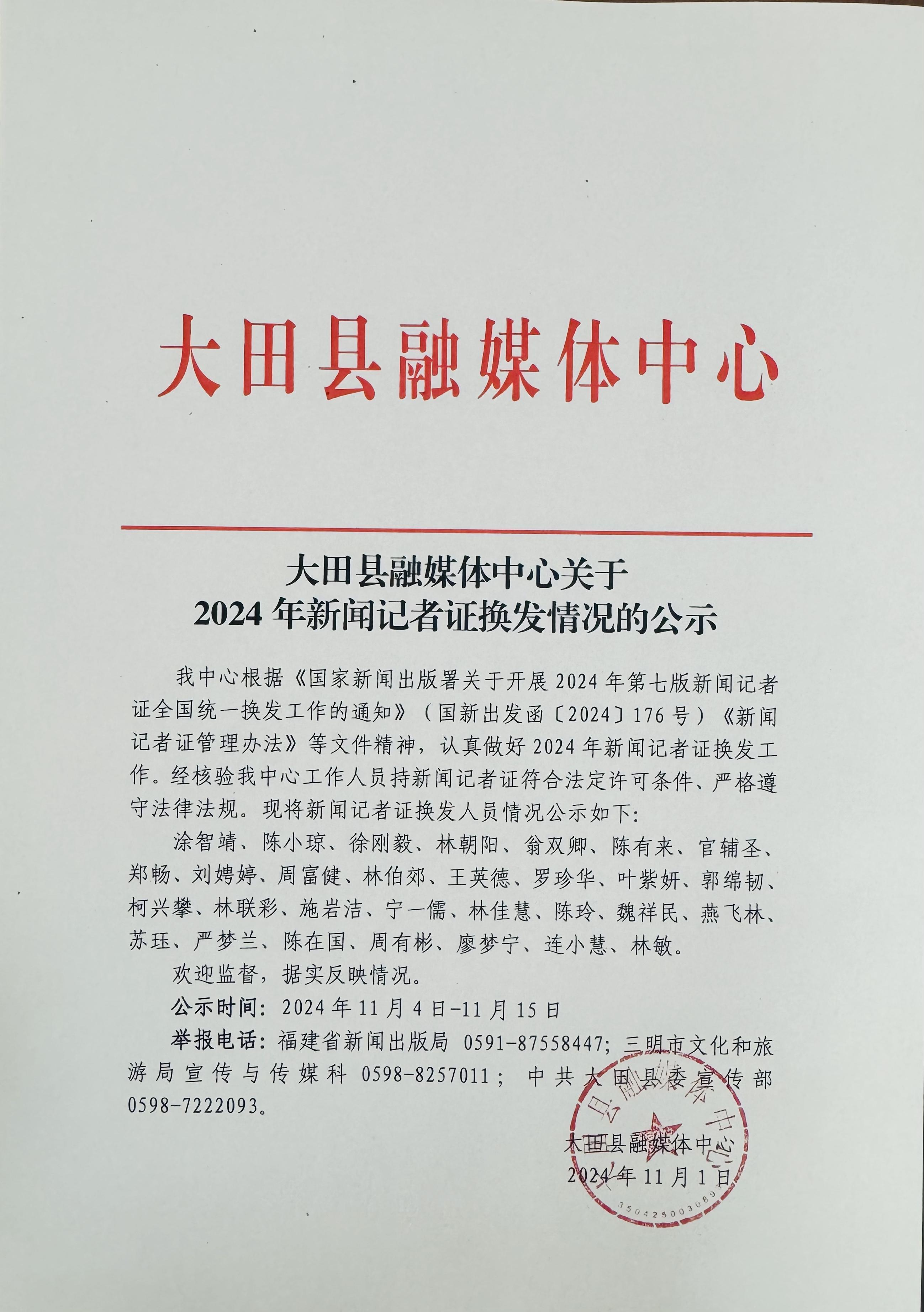 大田縣融媒體中心關于2024年新聞記者證換發情況的公示