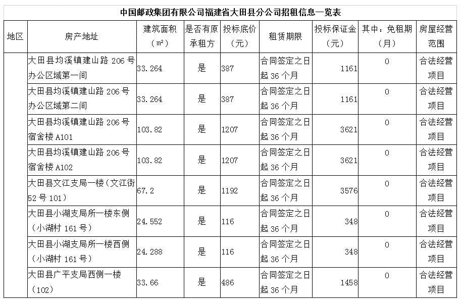 中國郵政集團有限公司福建省大田縣分公司 房屋出租公開招租公告 中國郵政集團有限公司福建省大田縣分公司(招租人)就大田縣8處(其中城區4處,區鄉4處)所屬房產對外出租公開招標,歡迎有意向的承租人前來響應報價。 一、招租內容
