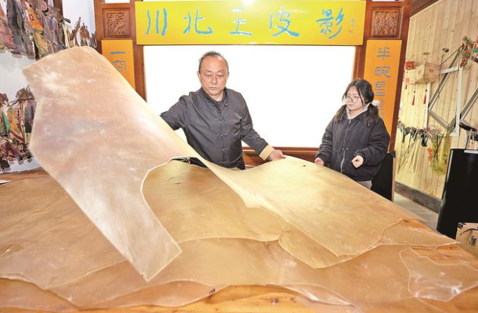 王彪(左)和徒弟陳靜在挑選用于制作影人的牛皮