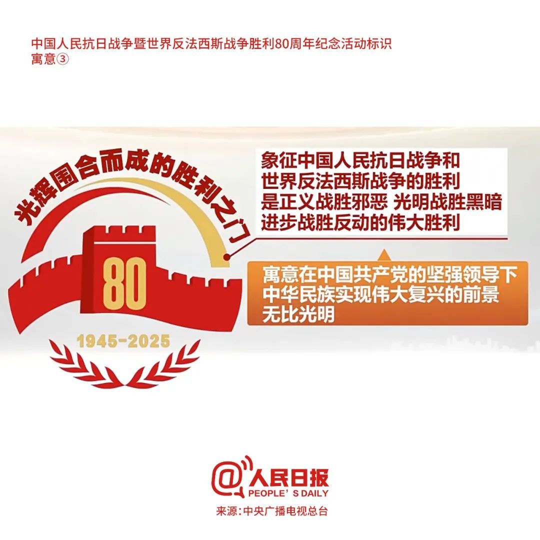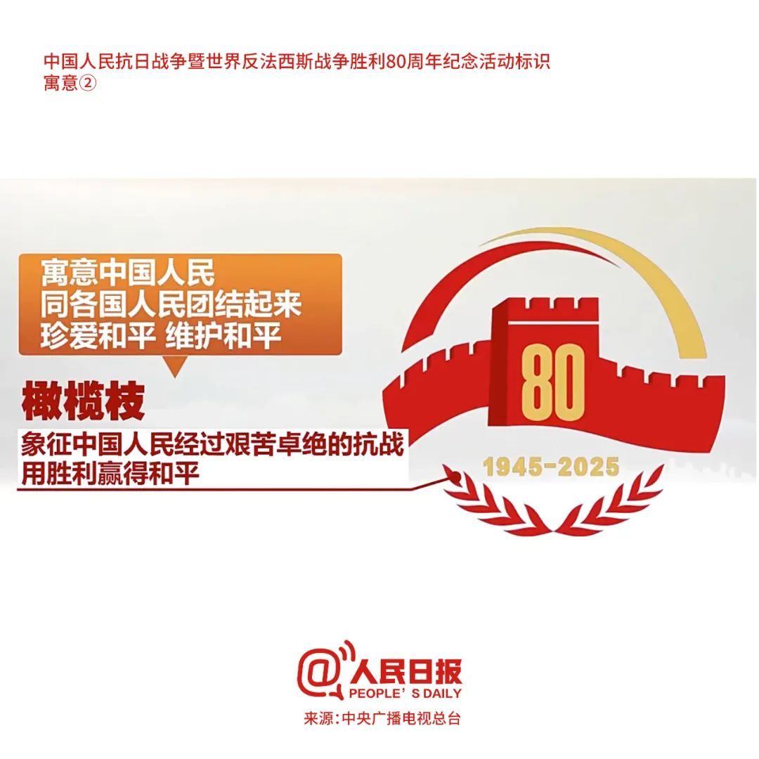 國務院新聞辦公室5月13日公開發布中國人民抗日戰爭暨世界反法西斯戰爭勝利80周年紀念活動標識及其使用說明。此標識為中國人民抗日戰爭暨世界反法西斯戰爭勝利80周年紀念活動的唯一指定標識。 標識由長城、橄欖枝、光輝、數字“80”、時間“1945—2025”構成。長城象征全民族眾志成城奮勇抗戰,寓意以愛國主義為核心的偉大民族精神是抗戰勝利的決定因素。橄欖枝象征中國人民經過艱苦卓絕的抗戰,用勝利贏得和平,寓意中國人民同各國人民團結起來,珍愛和平、維護和平。光輝圍合而成的勝利之門,象征中國人民抗日戰爭和世界反法西斯戰爭的勝利是正義戰勝邪惡、光明戰勝黑暗、進步戰勝反動的偉大勝利,寓意在中國共產黨的堅強領導下,中華民族實現偉大復興的前景無比光明。