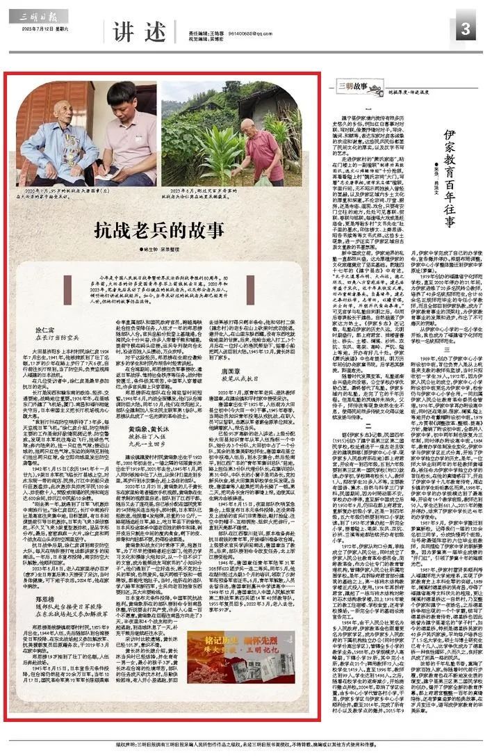 2020年7月,95歲的抗戰(zhàn)老兵唐國章(左)在大田縣的家中接受采訪。 已經(jīng)95歲高齡的老人講述:上級分配給大田縣知識青年從軍入伍指標一個中隊,細分為3個分隊,大田初中占了一個分隊,其余的是集美職校師生。唐國章在縣立初中核準入伍后,到永安集合,然后經(jīng)南平,到江西廣豐的“青年軍集訓總隊”駐地,路上擔任第3分隊代理分隊長。 1945年8月15日,夜里部隊吹哨緊急集合,上級宣布日本無條件投降,還沒來得及上戰(zhàn)場的官兵們非常激動,敲打臉盆、往空中扔帽子、互相擁抱、組織火把游行,一直到天亮都不睡覺。 部隊在江西黎川駐訓,原本準備奔赴抗日前線的青年軍,開拔福州準備收臺灣。上級要求官兵學講閩南話,唐國章當了教員。后來,部隊接到命令改變?nèi)蝿?wù),北上浙江接受檢閱。 1946年,唐國章任青年軍陸軍31軍208師622團步兵一連二等兵。同年5月,他在湖州經(jīng)過為期3個月的培訓,領(lǐng)取了少尉軍銜預備軍官證書。6月,青年軍解散,人員去留自選,唐國章到嘉興中學讀高中……1949年12月,唐國章加入中國人民解放軍第二野戰(zhàn)軍第四兵團14軍40師教導隊,1955年復員回鄉(xiāng)。2022年3月,老人去世,享年97歲。 文章發(fā)表于 2025年7月12日 《三明日報》第三版 ↓↓↓