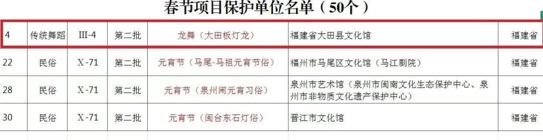 近日 文旅部辦公廳印發(fā) 《關(guān)于公布我國列入聯(lián)合國教科文組織 非物質(zhì)文化遺產(chǎn)名錄名冊項目 牽頭保護(hù)單位名單的通知》 福建省大田縣文化館正式入選 “春節(jié)—— 中國人慶祝傳統(tǒng)新年的社會實(shí)踐”子項目 ——龍舞(大田板燈龍)的保護(hù)單位