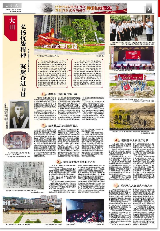 大田縣開展抗戰主題演講比賽 今年是中國人民抗日戰爭暨世界反法西斯戰爭勝利80周年。大田是紅軍北上抗日先遣隊攻占的第一座縣城,同時是中國東南抗戰文化中心之一、抗戰時期閩西北抗日救亡和反頑斗爭中心、陳嘉庚先生宣傳抗日主張的后方陣地。為深入貫徹落實習近平總書記在福建考察時的重要講話精神,傳承弘揚偉大抗戰精神,加快推進大田革命老區高質量發展,今年初,大田縣組織縣社科聯、檔案館、黨史和地方志研究室、大田“第二集美學村”保護與開發工作指揮部等單位,尋訪發生在縣內各地的抗戰往事,深度挖掘縣域抗戰文化資源和價值,充分釋放大田縣抗戰文化效能,營造傳承弘揚偉大抗戰精神的濃厚氛圍。 紅軍北上抗日攻占第一城 “我抗日先遣隊進到大田,城內的保安團匪早已聞風逃竄,我軍入城后,繳到步槍十余支,無線電和電話機各一架,食鹽萬余斤,受到當地工農群眾熱烈的歡迎。”《中國工農紅軍北上抗日先遣隊始末》記載。 1934年7月20日,由紅七軍團改組的紅軍北上抗日先遣隊6000余人,在軍團長尋淮洲、政委樂少華、參謀長粟裕、政治部主任劉英率領下,與掩護其行動的紅九軍團4000多人,從永安西洋進入大田后,先頭部隊經宋京、蓮花崎直抵城西白巖山,大田成為紅軍北上抗日先遣隊攻占的第一座縣城。指揮部設立在西門的育智小學,戰士們拆除城墻的城垛,燒毀了鳳凰山、白巖山、霞山、禁山等處的炮樓,沒收土豪劣紳的糧食和財產分發給貧苦農民,把《中國工農紅軍北上抗日宣言》《北上抗日先遣隊告農民書》等傳單進行張貼和分發。 7月23日,紅軍北上抗日先遣隊撤離大田縣城關,次日到達高才坂,宣布成立當地蘇維埃政府;25日,經尤溪縣四科亭向樟湖坂地區挺進……