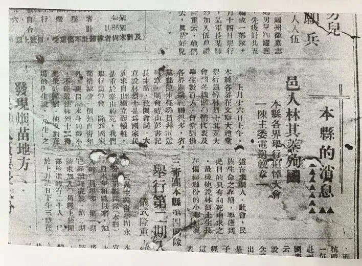 刊登有林其蓁殉國舉行追悼會報道的《大田通訊》。 (大田縣檔案館 供圖) 1940年4月底,武陵籍學生、中共黨員林其蓁參加北平西山游擊隊,在執行任務中被日寇逮捕,同年6月9日被殺害。林其蓁是大田首位為抗戰而犧牲的烈士,大田各界在縣城文廟大禮堂隆重召開追悼會,黨政機關官員、各群眾團體負責人、城區各界愛國人士和大田縣立初中、均溪小學、集美職校的師生等共計600多人參加。其父林笏隆在抗日救亡運動中帶頭捐獻巨款購買飛機大炮支援前線,獲得當時福建省政府授予的“同心協力抗擊日寇”牌匾。