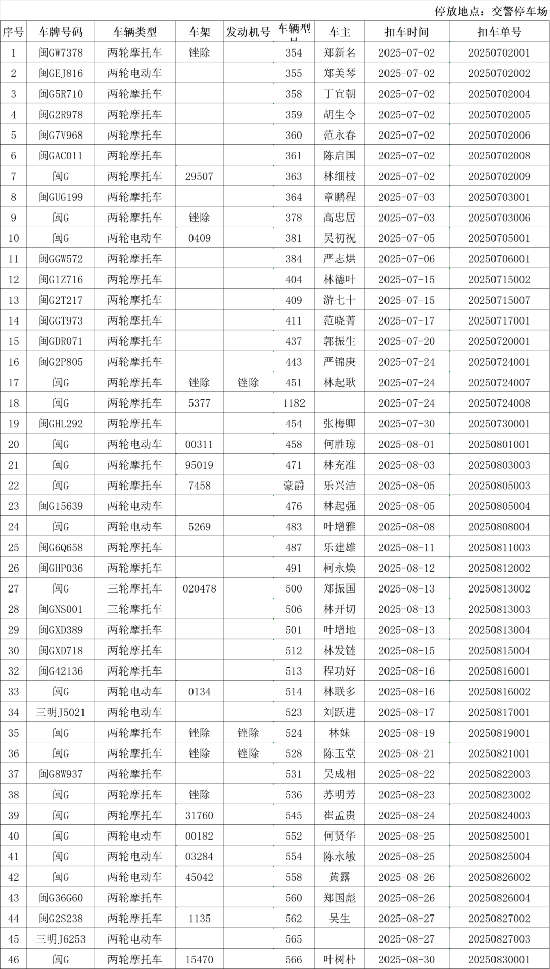 根據《中華人民共和國道路交通安全法》第一百一十二條第三款和《中華人民共和國道路交通安全法實施條例》第一百零七條之規定,現將大田縣公安局交通管理大隊2025年7月至2025年8月依法扣留的逾期不來接受處理的下列車輛進行公告。請機動車駕駛人或者車輛所有人、管理人見公告后及時前來接受處理。經公告三個月仍不前來接受處理的,我隊將對扣留車輛依法進行處理。